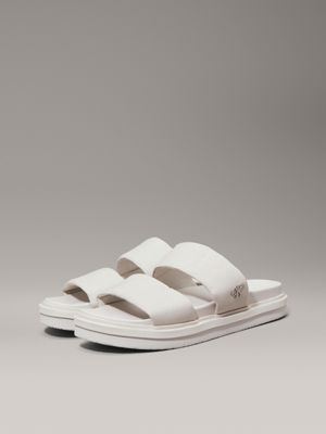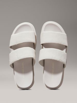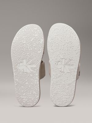 The sandal upper is crafted from 60% recycled cotton, created by reprocessing existing cotton materials.