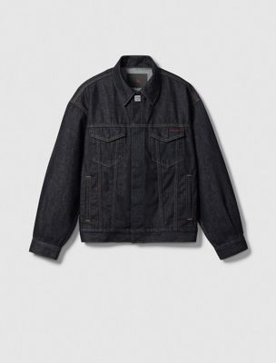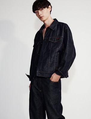 Calvin Luo for Calvin Klein. Inspired by the new year of the snake. A day-to-night celebration of tradition, through a modern lens. A classic trucker, made from indigo rinse denim. Designed with custom pewter hardware and red logo accents.
