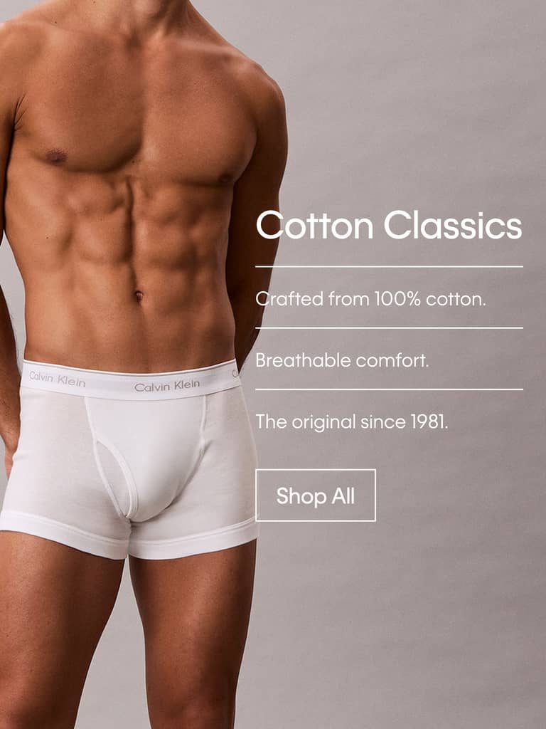 Elevate your style with Calvin Klein men's underwear. Signature details. Stylish cuts. Second-skin comfort. Shop sleek boxers, sexy jockstraps and signature briefs designed for maximum comfort and confidence. Crafted with high-quality cotton and breathable fabrics, each piece offers a form-fitting fit. Let the iconic CK logo waistband peek out subtly from underneath your jeans. Finish the look with a hoodie and trainers for a quintessential CK style. Can’t get enough? Stock up on our multipacks for ultimate convenience. Calvin Klein underwear for men. Undress with confidence.